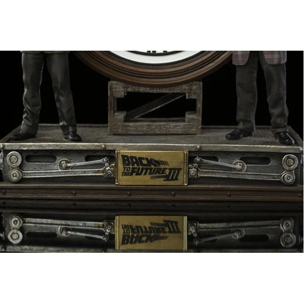 The big time meter, the famous clock with Roman numerals, is supported by a rustic wooden box. The protagonists of “Back to the Future” are right in front of it, standing on a base with elements and machinery that resemble an old locomotive, another striking machine, and presented in the third film of the saga. With a plaque having the movie’s logo at the bottom of the base, Iron Studios proudly presents its new statue “Marty and Doc at the Clock Deluxe Art Scale 1/10 – Back to the Future III”.