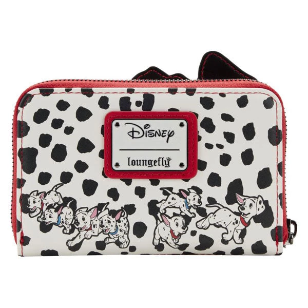 One stormy evening, Perdita gives birth to fifteen puppies. Eager to purchase them, Cruella shows up unannounced and is horrified to learn not only are the puppies spotless for a few weeks, but that Roger and Anita refuse to sell them. And so began her plan to steal not only their puppies, but eighty-four more. In this Loungefly design, custom-shaped applique depicts Cruella holding a puppy with a wicked grin, surrounded by dalmatian spots. The pattern extends onto the back of the wallet, where more puppies are featured running from her grasp.