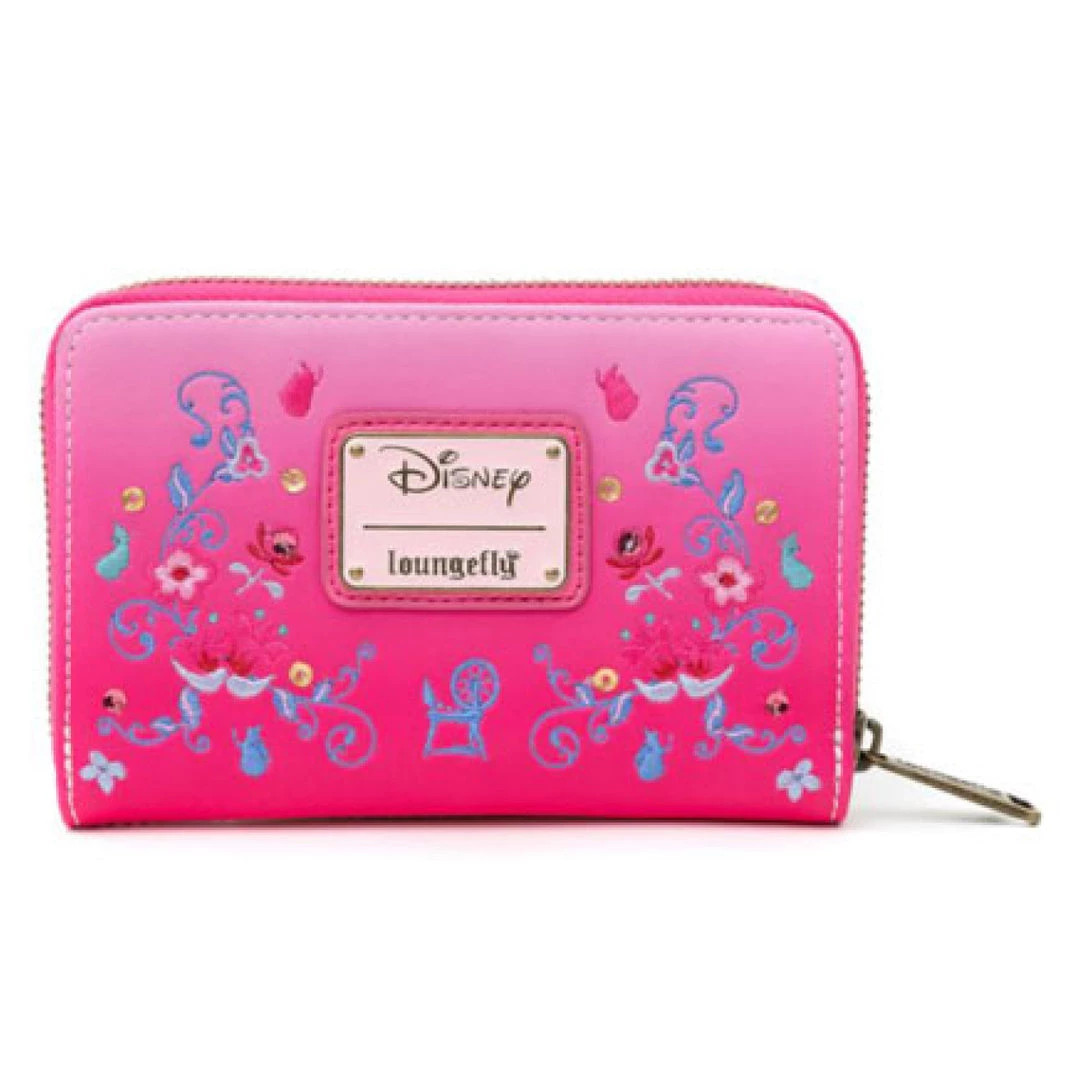 This stunning pink accessory captures Aurora in the arms of her Prince Phillip on the front zipper compartment, dancing among the clouds in a dream-like scene. Silhouettes of birds pour in on the beautiful scene and is framed by gorgeous applique, while the back is adorned with beautifully embroidered flowers, foliage and sequins.