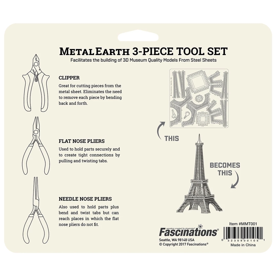 A tool kit containing clippers, flat nose pliers and needle nose pliers, ideal for building Metal Earth models.