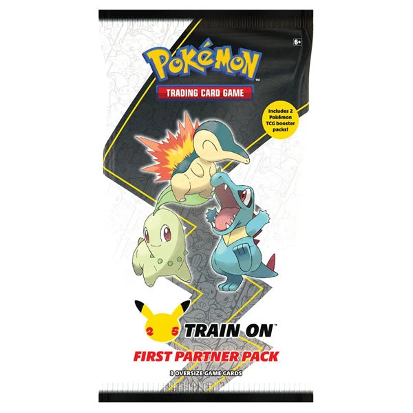A big celebration – with gigantic Pokémon TCG cards! This First Partner Pack contains a set of 3 awesome oversize cards for your Pokémon TCG collection, featuring the three first partner Pokémon of the Johto region – Chikorita, Cyndaquil, and Totodile – plus two regular Pokémon TCG booster packs!